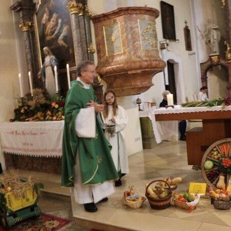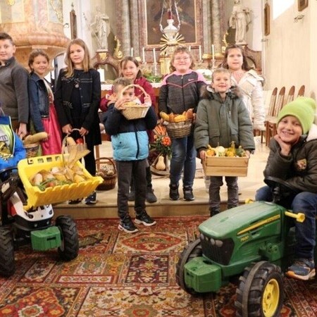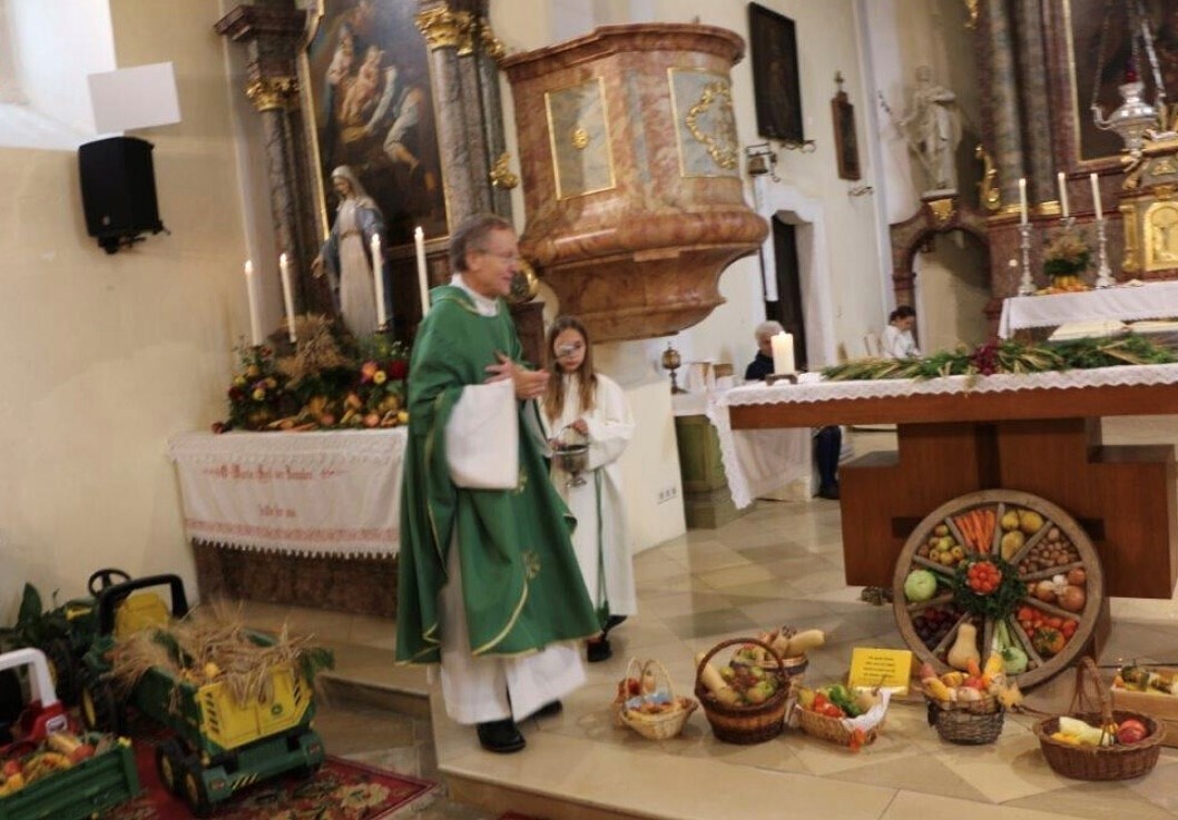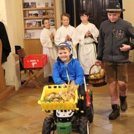 Mit Traktoren wurden die Gaben in einem feierlichen Einzug zum Altar gebracht, wo Mod. Christof Hinc diese segnete.