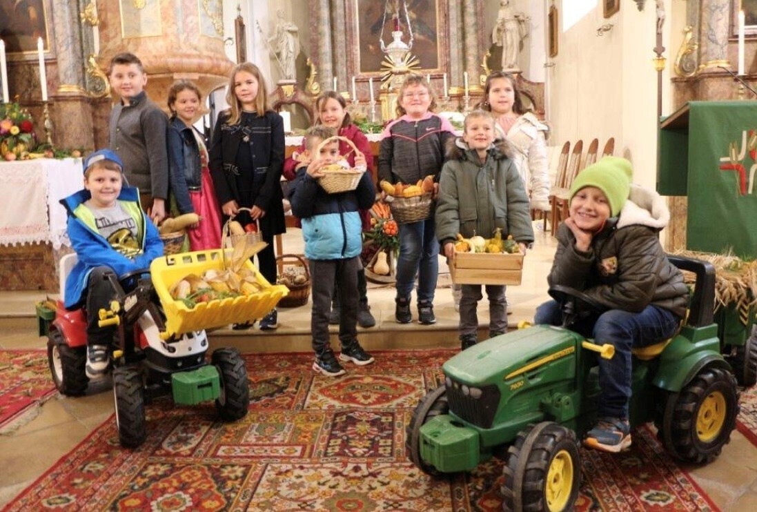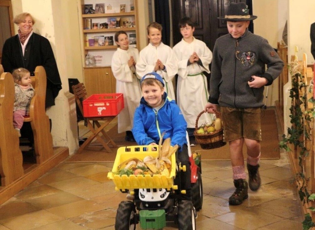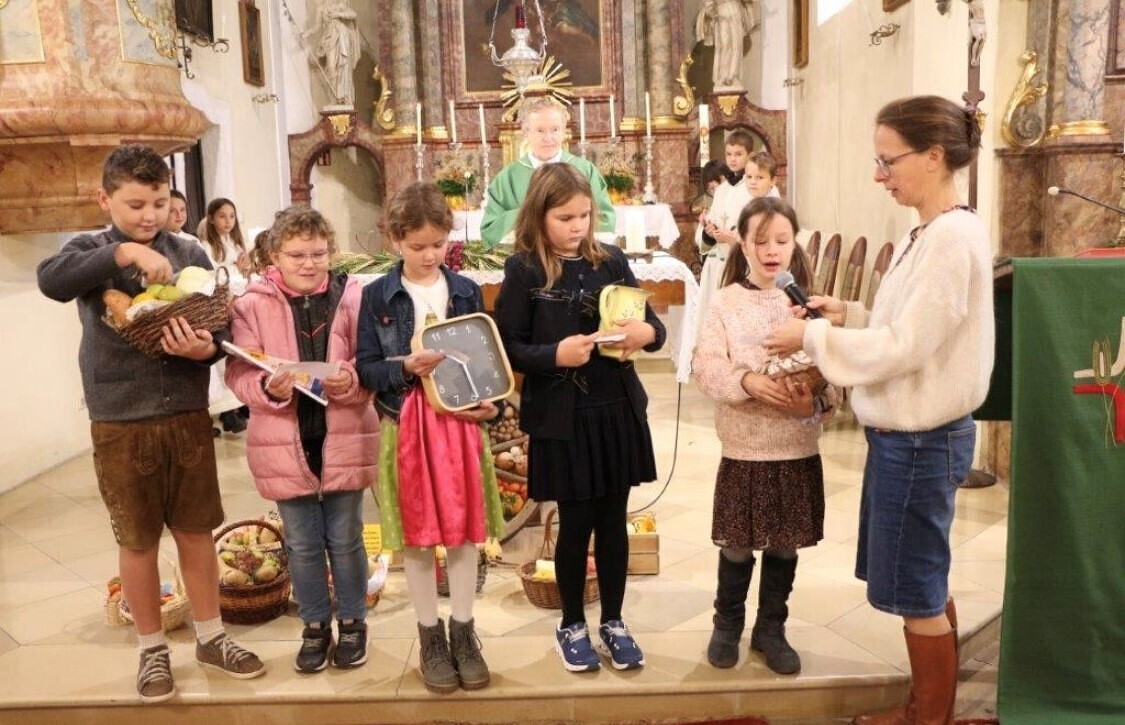Die Kinder des Kindergarten und der Volksschule waren mit großer Begeisterung dabei und bereiteten zahlreiche Körbchen mit den Früchten von Garten und Acker für den Gottedienst vor. Sie brachten auch in den Fürbitten den Dank an den Herren dar.