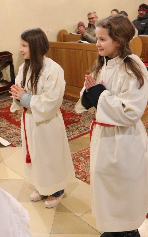 Am Christkönigssonntag wurden zu Beginn die beiden Mädchen Theresa Tod und Antonia Zeller als neue Ministrantinnen in die Schar der Ministrantinnen aufgenommen. Als äußeres Zeichen erhielten sie die Kleidung der Ministranten – ein weißes Rochett, das Zingulum und das Kreuz – welche sie mithilfe des Herrn Pfarrers anzogen. Stolz vor Freude zeigten sie sich unter dem Applaus der zahlreich anwesenden Pfarrgemeinde.
